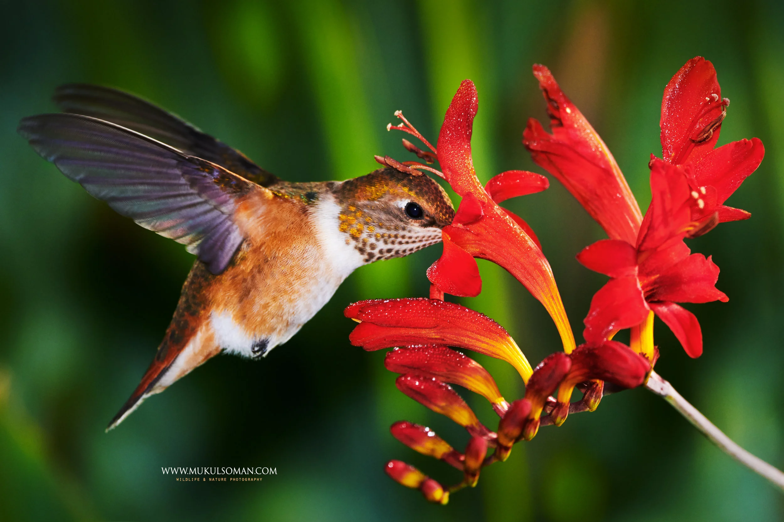 For this portrait of a Rufous Hummingbird, I used a very slow shutter speed of 1/25th of a second and a very tiny aperture of f/29 and paired it with the flash set at full power. I have been wanting to capture a portrait of a Hummingbird, using slow shutter speed technique and rear sync flash for a while now. I wanted to get the body and head still while the wings blend into a symphony of blur. Got to execute it this weekend and i am quite happy with the way this turned out! I didn't think that I would ever use a shutter speed of 1/25 sec on a hummingbird! The result was definitely pleasing artistically, to my eyes atleast!
